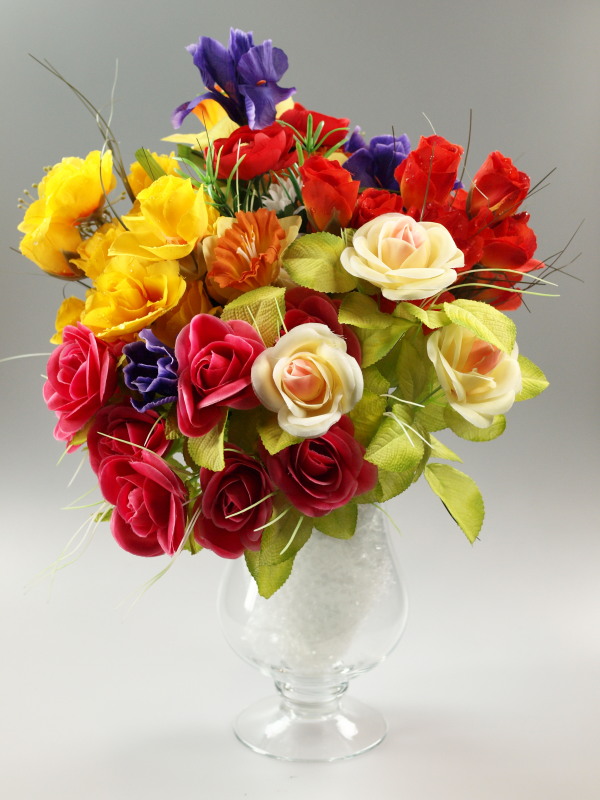 Bouquet di fiori incantevoli se non fosse per il fatto che sono finti, composizione all'apparenza valida ma perde di nitidezza sul vaso (forse sarebbe stato meglio una ripresa parallela al vaso stesso), infine un leggero taglio alle foglie, tre fattori che secondo me pregiudicano la foto stessa.