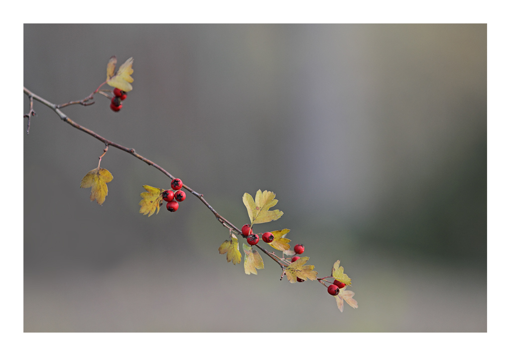Mi piace molto il contrasto tra le cromie calde dalle bacche e il fondo morbido e omogeneo grigio. Peccato solo che la parte iniziale del ramo sulla sinistra non sia perfettamente a fuoco. L'effetto è in ogni caso gradevole.