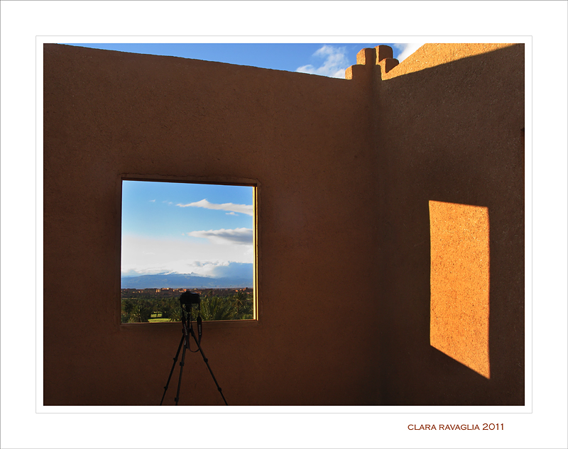 Per un attimo mi hai dato da pensare... dato che io non ho modificato nulla in questa foto, se non taglaire un filo in alto per far coincidere gli angoli superiori con le linee in discesa della zona in ombra. Ma, pensandoci, si tratta di una terrazza sul tetto dell'albergo.. dove c'era un vero labirinto di pareti in pisè con queste strane fenestrature multiple e incastri tipo di box concatenantesi come delle matrioske. Ora no ricordo perfettamente, ma c'era sicuramente una finetra a fronte, fuori campo, che determina il rombo di luce al alto opposto.