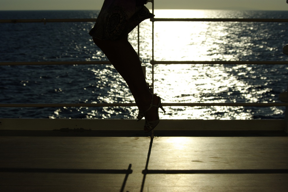 personalmente avrei cercato di tenere la silhouette delle gambe più centrali con la scia luminosa del sole, per evitare quella massa bianca, ingestibile dalla fotocamera e non restituisce una bella resa sul piano narrativo.