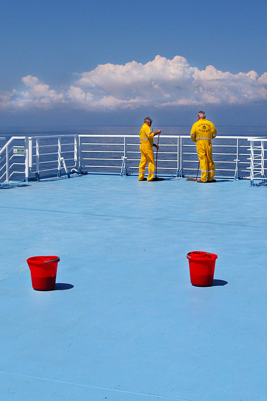 Bella foto. Ottimo il colpo d'occhio nell'inquadrare soggetti cromaticamente diversi e interessanti. La vedrei meglio con un buon taglio in basso, in modo da portare i due secchi più in primo piano a guidare meglio l'occhio verso le due persone
