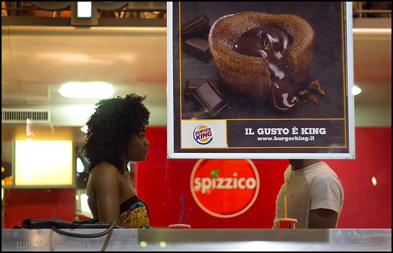 Il cartello, rappresenta i pensieri del ragazzo, come una sorta di fumetto..il suo pensiero lo si potrebbe sintetizzare cosi'..slurp che bel cioccolatino..ovvimente il colore della pelle della ragazza rafforza l'associazione.. Wink