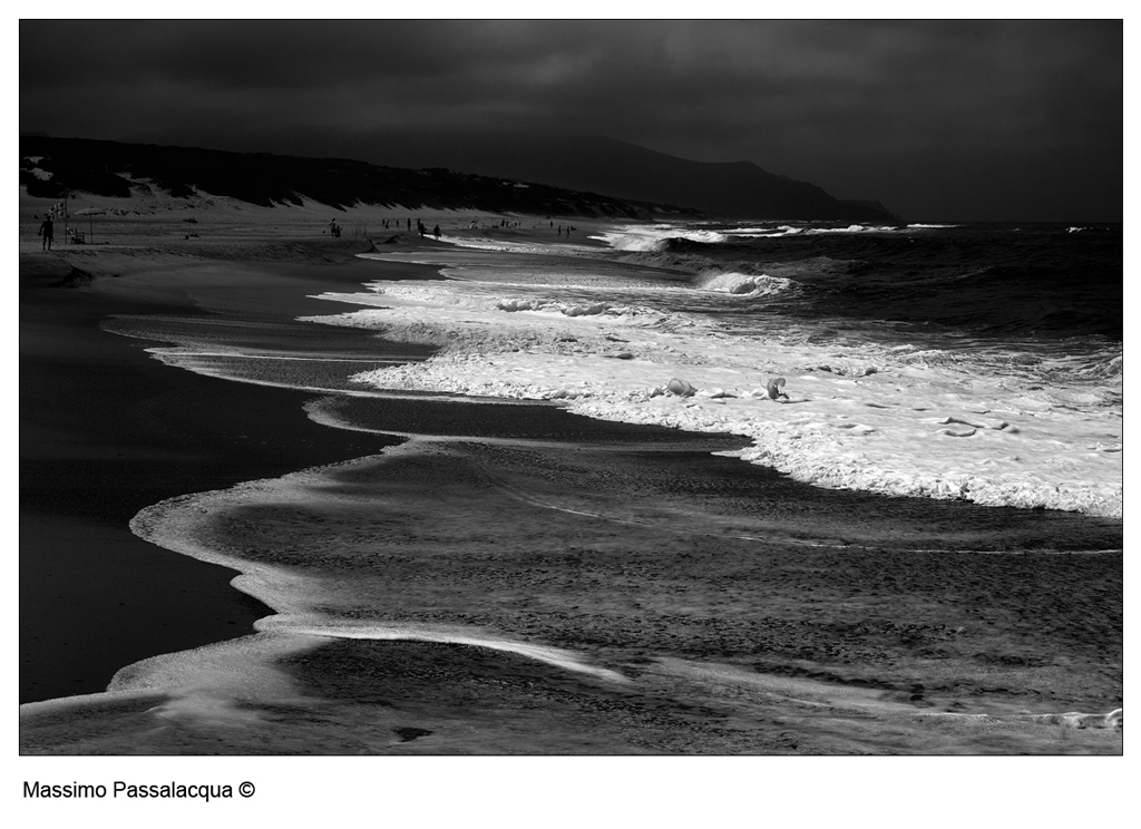Bellissimo b/n trovo che il cielo scuro di cupe nubi offre un contrasto magnifico con le schiumose onde, che illuminate dai raggi (quasi spot) sembrano fluorescenti.
