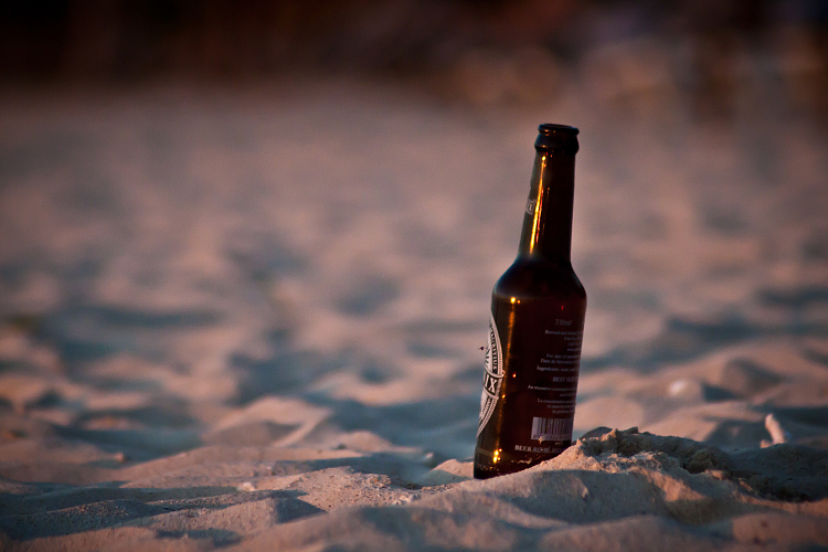 non è stato uno scatto programmato, la bottiglia era li e non l'ho toccata, la righina rossastra ci dà l'idea del momento della giornata, tramonto pieno, la mezza etichetta invece, fosse stata centrale sarebbe diventata quasi una pubblicità per la birra Mauriziana, invece anche li non concentra lo sguardo all'analizzare la marca ma concentra lo sguardo sull'insieme.