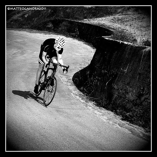 Mi piace il bel bn contrastato,come pure la composizione,ma l'inclinazione della strada-per quanto il grimpeaur sia in atteggiamento da salita-da l'idea di una discesa...