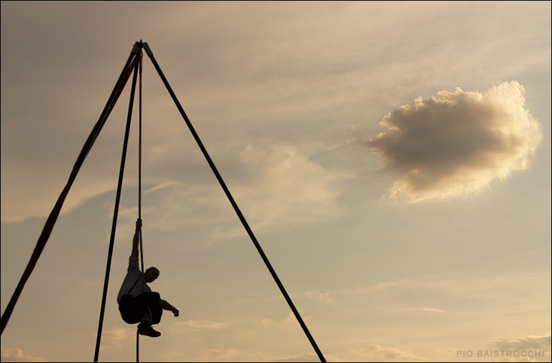 L'occhio così, dopo aver indugiato sulla perfetta postura funambolica dell'uomo, si proietta, percorrendo la diagonale, verso il suo alter ego celeste, restando appagato dalla perfetta corrispondenza, fisica e concettuale, dei due elementi ugualmente proiettati negli spazi celesti.