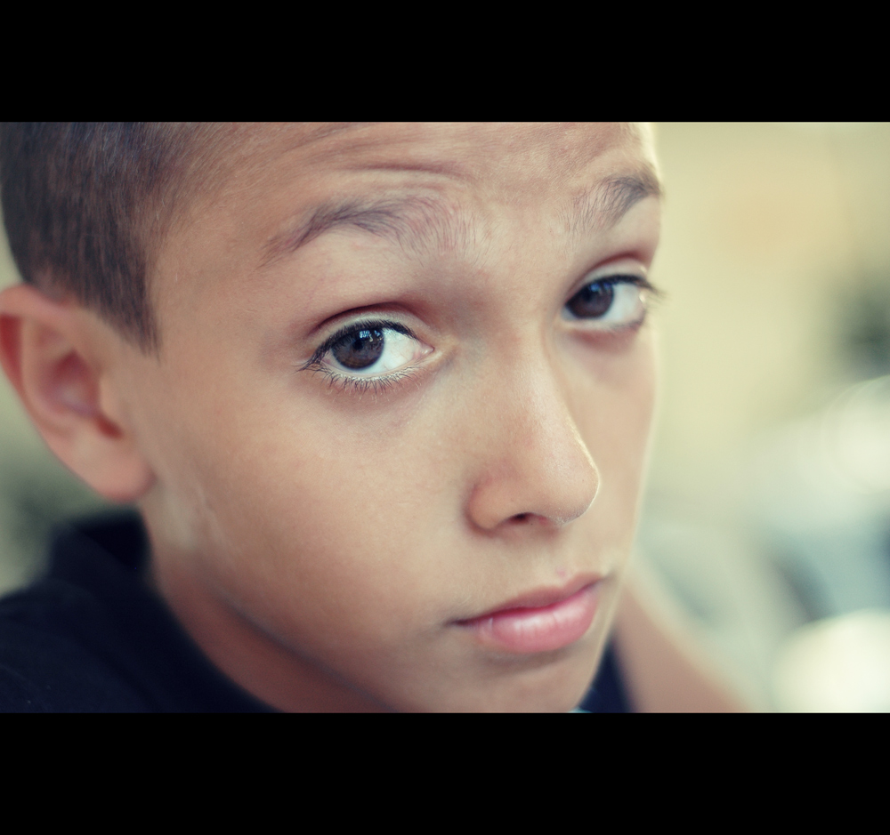 Il taglio stretto è qui il principale strumento espressivo di una inquadratura leggermente angolata e dall'alto che pare rispondere al piglio fermo e consapevole del giovane Fefo che sembra voler sostenere ..."dal basso" e quindi con maggiore forza il nostro sguardo ...con fierezza e ironica strafottenza.