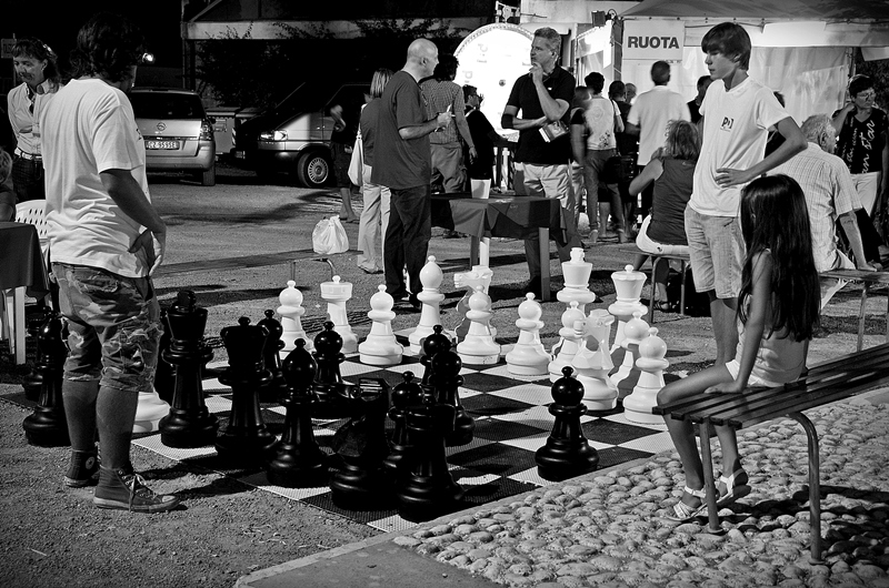 Trovo lo sfondo un po' dispersivo, ero in dubbio se la sfida fosse tra gli scacchisti (che non si notano immediatamente) o tra i due signori centrali in piedi.. _________________ Las penas y las vaquitas / se van por la misma senda |