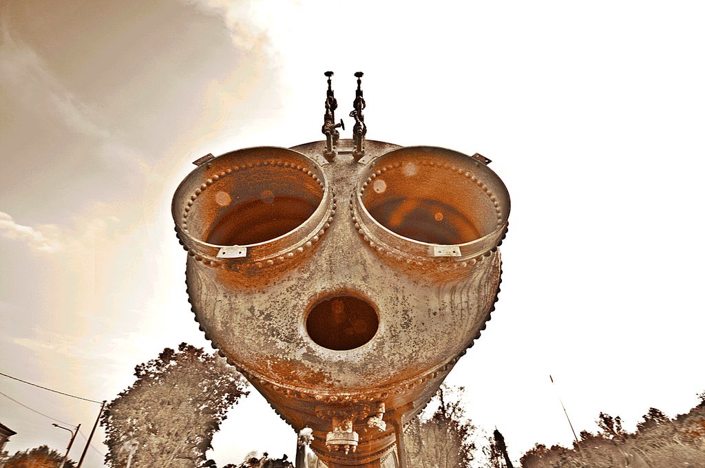 I pomelli di chiusura e i tubi sono diventati due statuine sacre che sembrano sorreggano un vessillo, grazie alla inquadratura dal basso.