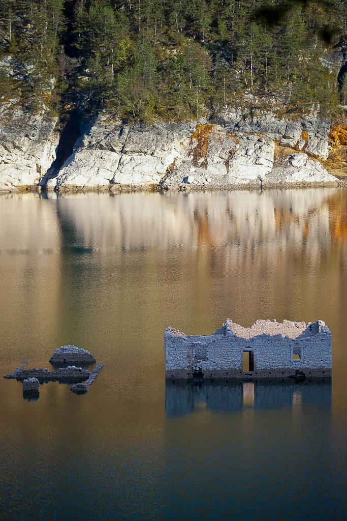 Le case del borgo di Redona, sommerse per la creazione di un bacino idrico poco prima di Tramonti, riemergono di tanto in tanto quando il lago si abbassa di livello. Fossili urbani della memoria locale.