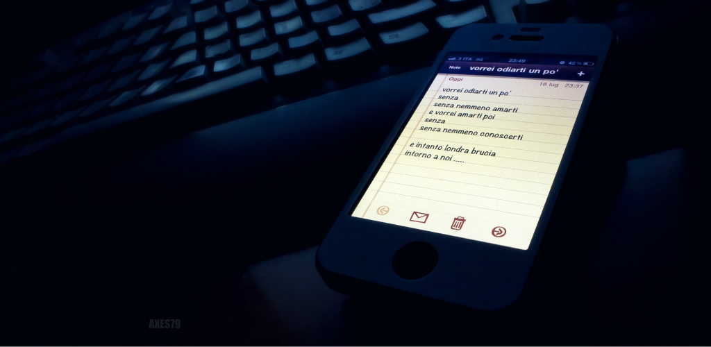 il concetto di questa foto è di per se molto impegnativo : sia a livello emotivo, sia a livello tecnico, poichè in queste condizioni di luce probabilmente io avrei ottenuto una fetecchia clamorosa. Invece, grazie forse alla luminosità del monitor, la luce accarezza i tasti della tastiera e il testo del telefono ha un dettaglio fantastico.