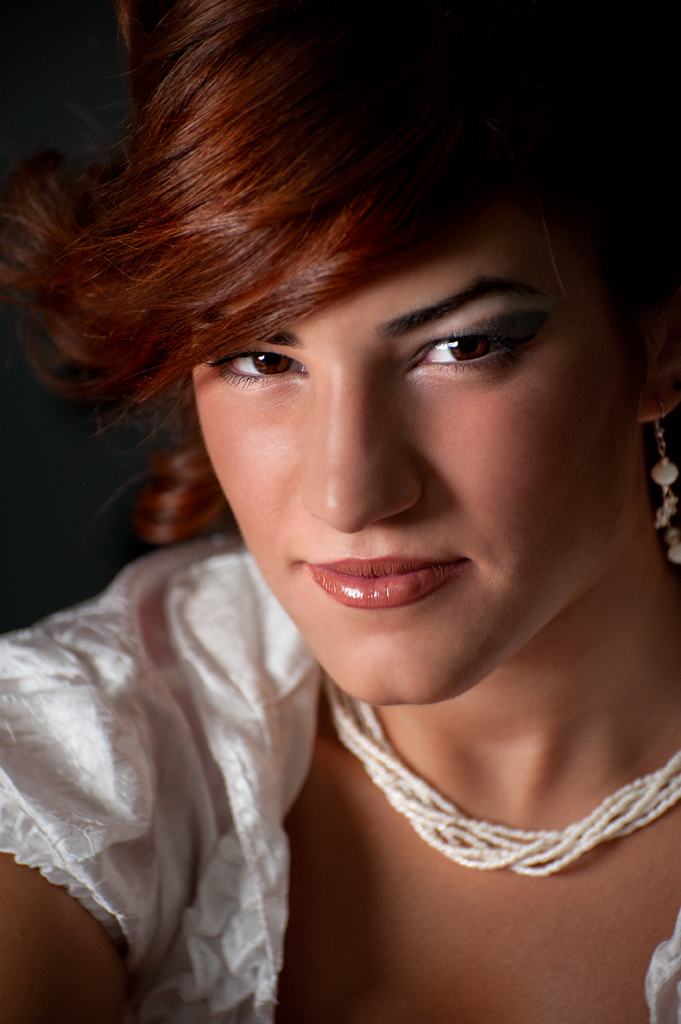 La posizione del braccio/spalla destro della modela mi disturba un po', la luce proveniente dalla sx della camera è ok così come lo sguardo, sento la mancanza di un pannello riflettente sulla destra per schiarire le ombre sul viso. Ok!