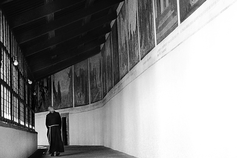 Problema. perdevo la centralita' del frate. ho quindi optato per perdere in aria sul basso e cercare di sfruttare la linea degli affreschi che parte dall'angolo alto a destra, come guida verso il cuore del fotogramma. So che e' fuori canone come traiettoria, ma se l'occhio cade sul bianco lo dovevo guidare. in questo percorso credo si riescano a notare prima gli affreschi contestualizzando la scena e poi l'occhio cade e resta legato per un po sul soggetto prima di seguire le linee in uscita sulla sinistra del fotogramma. (e se avessi tarato meno i livelli senza bruciare il bianco?????)