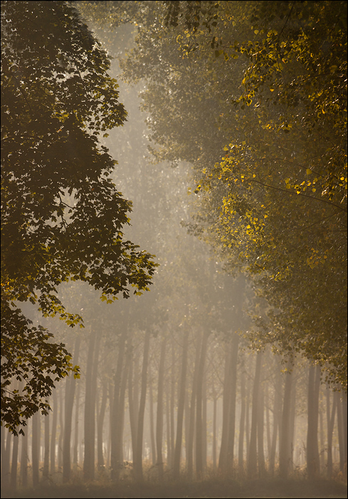 un susseguirsi di trame, come un sipario che si apre sui fitti tronchi dei pioppi.