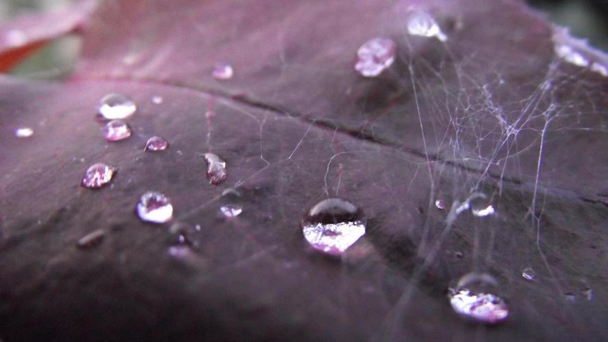 | La foglia di un roseto con una ragnatela e alcune gocce. |