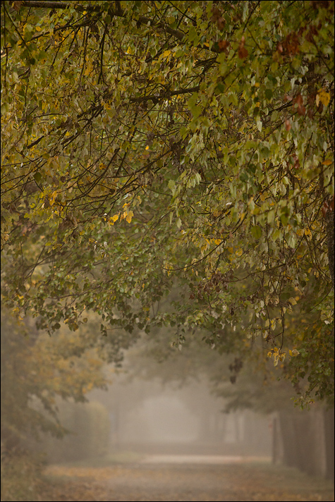 Uno scatto, come molti dei tuoi, che non cerca l'effetto speciale, sì piuttosto la delicata e carezzevole condivisione di un'atmosfera resa esplicita grazie alla perfetta rappresentazione degli elementi che la creano: la nebbia, anzitutto, ma anche l'importante e dettagliato proscenio delle foglie, la fuga dei tronchi, il sentiero costellato dalle foglie.