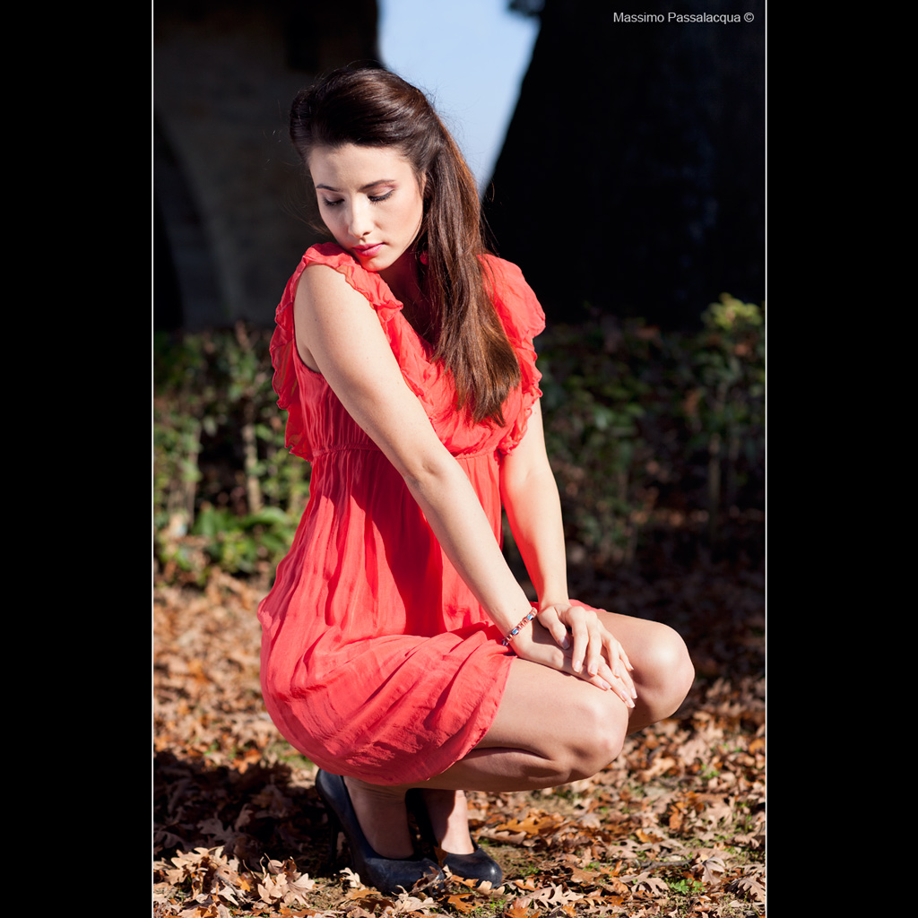 Ciao Massimo, affascina lo sguardo pudicamente abbassato della fanciulla (che brava!), che contrasta di molto con il fiammeggiante rosso dell'abitino; questo piccolo dialogo tra opposte intenzioni mi sembra uno dei motivi portanti dello scatto, oltre alla perizia tecnica ed alla bellezza della resa coloristica. Unico appunto, ma non so quanto ci potevi rimediare, riguarda quella specie di triangolo di cielo che interferisce con la figura.
