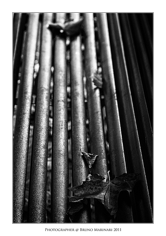 Una bella foto brunomar, ma gioca principalmente sul contrasto chiaroscuro fra una natura ''morta'' e il grafismo di una panchina, che qui assume in modo surreale le sembianze di una gabbia,