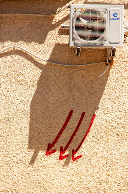 Interessante il grafismo che fa il verso sia alla direzione dell'ombra del condizionatore e sia ad un ipotetico direzionare le ventole dell'apparecchio stesso...