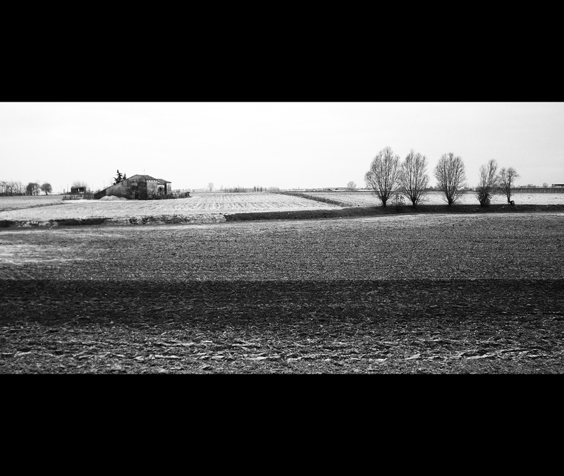 Il bianco e nero, in questo caso, esalta casolare e alberi sottolineando pure la differenza striata del terreno...