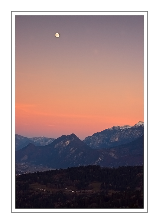 avrei scurito il primo piano anche perdendo leggibilità,lasciando il profilo delle montagne con quella sfumatura nel cielo impreziosita dalla luna in alto.