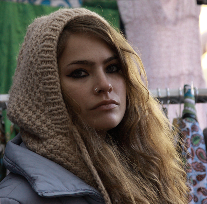 scatto rubato...ero con un pò di amici a londra e come al solito le donne si fermano in ogni bancarella...questa ragazza si è girata un attimo e ha guardato verso di me....vendeva abbigliamento di lana nella bancarella vicina a quella dove eravamo noi.... è stato un attimo....