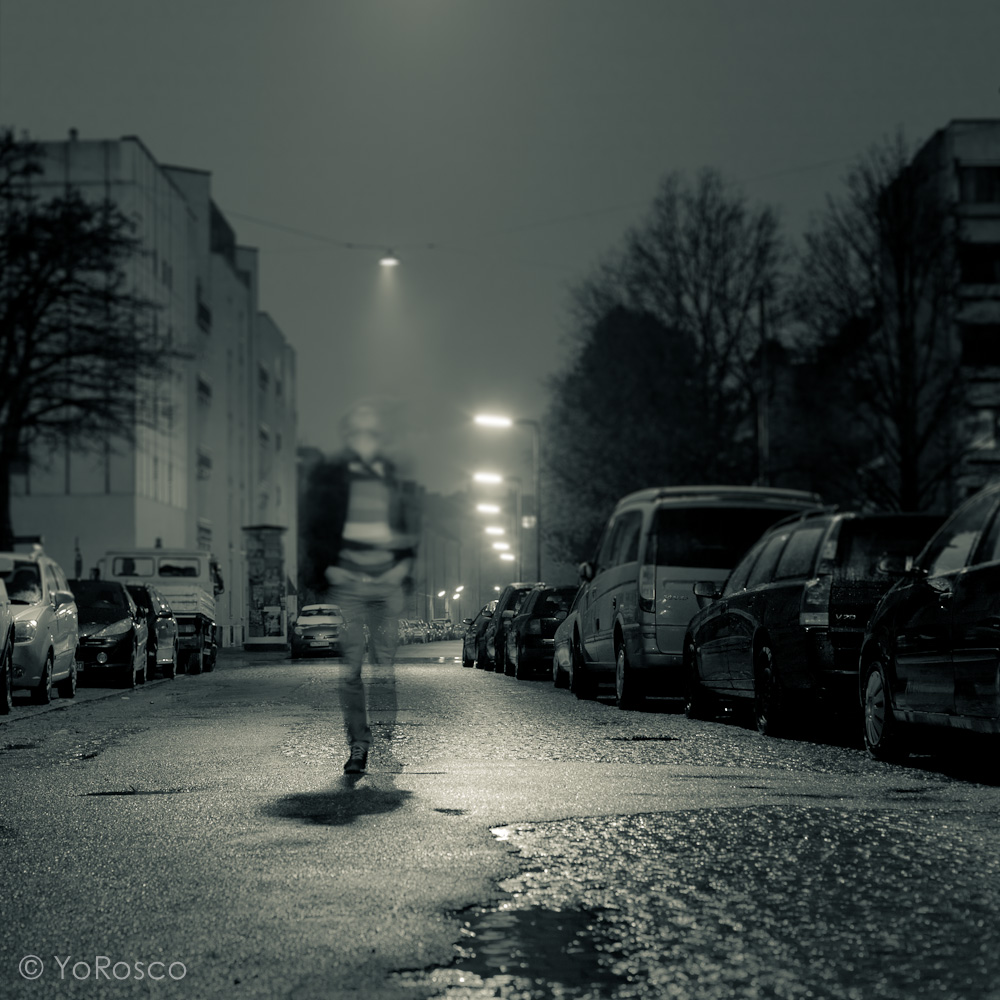 cmq mi piace l'atmosfera, la prospettiva disegnata dei lampioni, la nitidezza della prima parte della foto che lentamente lascia posto ad una leggera indefinitezza che tranquillizza l'attenzione dell'osservatore. La chicca é lo sguardo verso l'alto del soggetto quando ha appena passato la prova della luce del lampione centrale che gli stava sopra.
