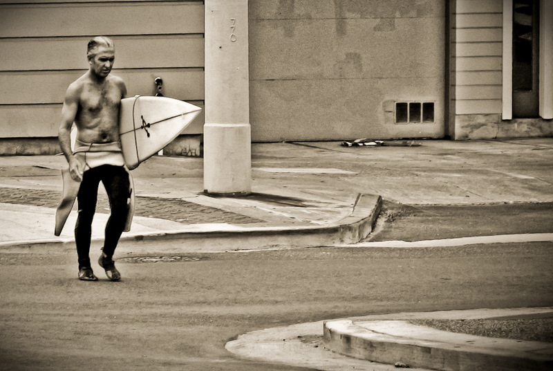 Al di lá di questo, a mio parere la ripresa é troppo stretta per rappresentare efficacemente l'ambiente e l'apparente desolazione del luogo lascia un che di insoluto nel racconto (mi sarebbe piaciuto ad esempio vedere qualche interazione tra il surfista e gli altri passanti, ammesso che ce ne fossero). Ripreso cosi', da solo, il povero surfista mostra, oltre che i segni degli anni, anche gli effetti di una scarsa niditezza fotografica (micromosso ?)