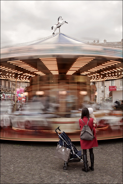 Non uno scatto d'assalto, preso al volo ....ma visto, colto ed assemblato nel mirino con tutti gli elementi compositivi al posto giusto...in primis il già citato cavallino, e, a seguire, la simmetria dell'immagine-giostra....