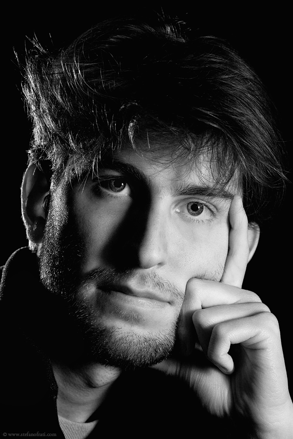Volevo un'immagine dai forti contrasti ma non amo lasciare una metà del viso totalmente in ombra, così ho pensato a direzionare la luce alla destra della fotocamera sino a che anche l'occhio destro del soggetto fosse ben illuminato e lasciando il resto in ombra. La conversione decisa in BN ha poi chiuso i neri rendendo, in effetti, l'ombra importante.
