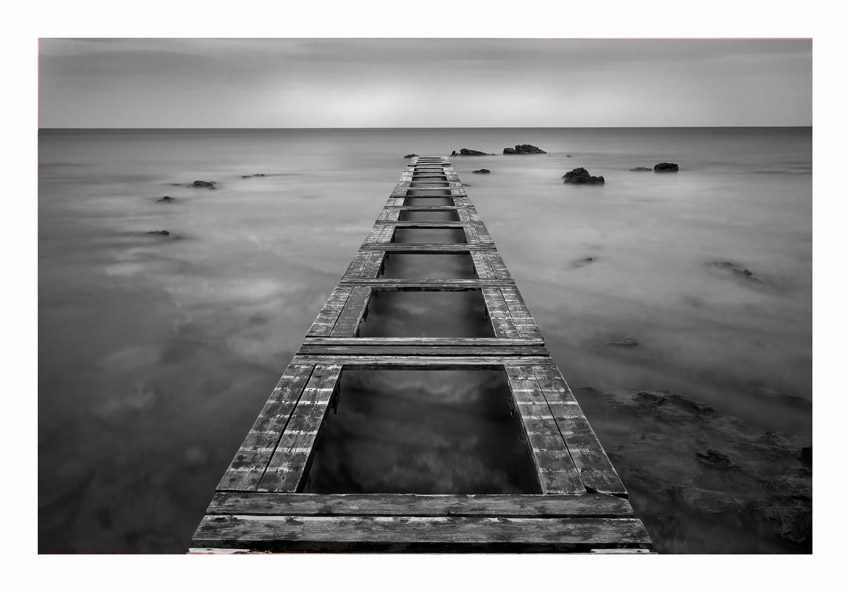 Bella! La simmetria rotta solo dagli scogli ed il tempo lungo rendono questa immagine "senza tempo". Il bn completa il tutto!