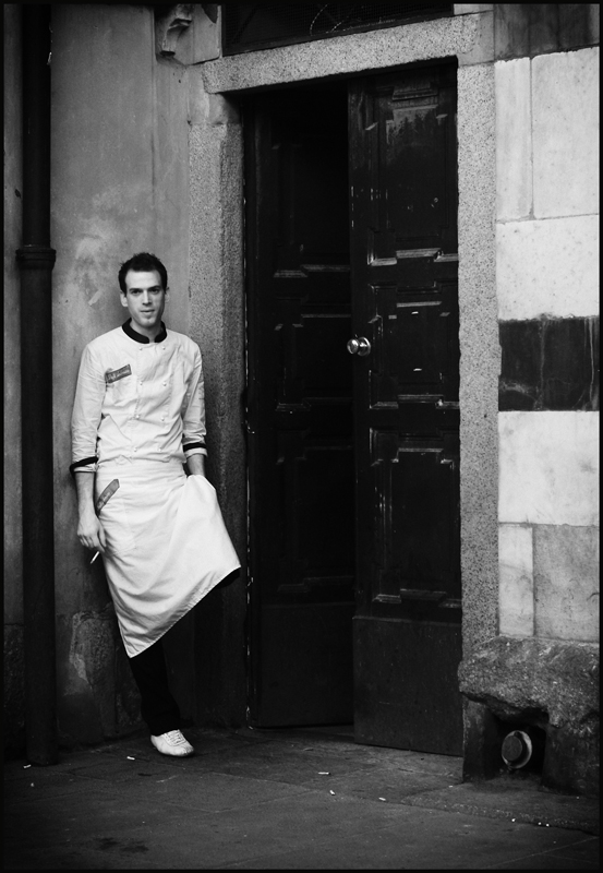 Pausa sigaretta per una life/ritratto ambientato, mi piace anche il raccordo tonale a dx dove la scansione bianco/nero riprende a grandi linee la divisa del ragazzo.