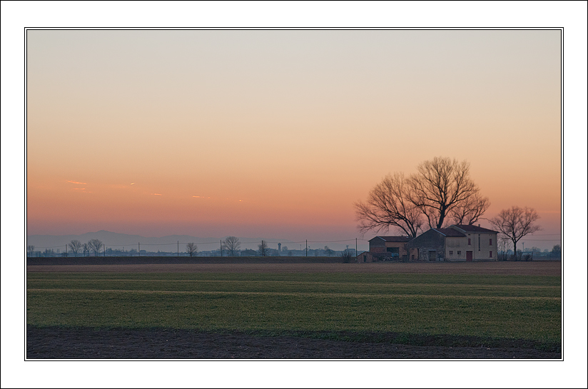 Ottima composizione con una piacevolissima geometria cromatica, sfumata nel cielo, piu netta sul terreno,con quella "cascina"e i rami degli alberi al posto giusto. Complimenti bella foto