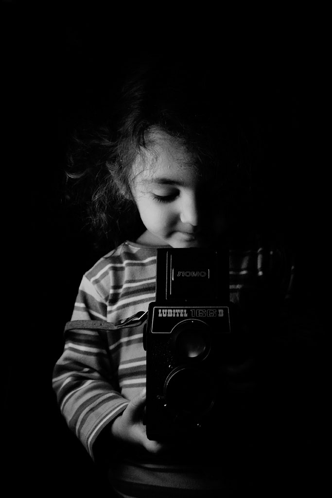 troppo carina questa giovanissima fotografa che guarda nel pozzetto della lubitel. molto originale la scelta di illuminare questa scena così inconsueta con una sola lama di luce che, da sola, è sufficientemente descrittiva e crea atmosfera. a me piace parecchio. hai già provato a stamparla?