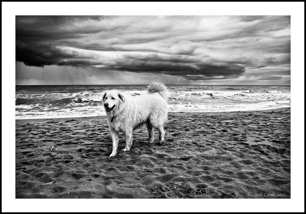 Mi piace molto questo b/n con questo cielo "carico",il cane personalmente lo avrei preferito sulla dx con lo sguardo fuori campo,parere mio,comunque una bella foto.
