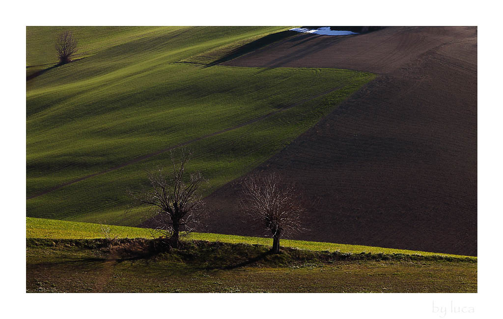 Buona la grafia del terreno ma c'è un senso di incompiuto..., la neve al bordo e le ombre fanno capire che hai tagliato al limite qualcosa che comunque fa ancora parte del quadro..., l'unica alternativa è tagliare via tutta la parte alta e giocare con le diagonali e due alberi. Ciao.