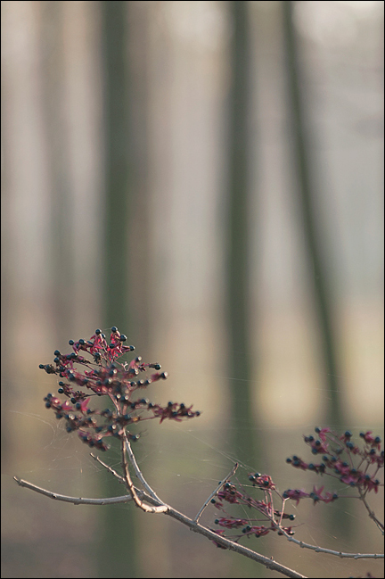 La grande nitidezza del primo piano, tale da evidenziare la texture delle ragnatele si staglia deliziosamente sullo sfuocato dello sfondo, fornendo grande suggestione allo slancio verticale dei tronchi.