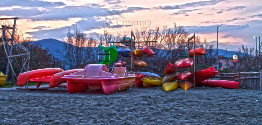 La scelta di esasperare i colori trasformando gli scafi in enormi caramelle contrasta (secondo me fastidiosamente) con le cromie naturali che si possono supporre data la luce che fa da contorno. Manca in fondo un punto sul quale l'occhio possa sostare attratta da un qualche motivo di interesse. Anzi c'è un certo caos visivo, soprattutto nell'area centrale (quella sotto la tua firma che a questo contribuisce ulteriormente). Perdona la franchezza ma non lo trovo uno scatto ben riuscito.