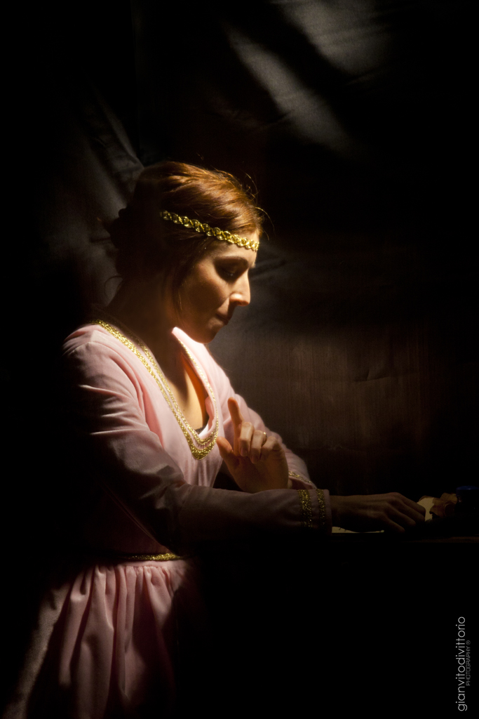 La luce è buona, in alcuni punti molto bella (vedi per esempio il panneggio del vestito sotto la vita). Non sembra proprio nitidissima sul viso (teatro o set casalingo?) e forse il momento colto blocca un atteggiamento della bocca (durante una lettura?, e perché silente?) non proprio fotogenico. A mio avviso un po' eccessivo lo spazio sopra la testa e (se hai curato tu il set) una stiratina ai teli sullo sfondo per eliminare qualche piega ci stava bene. Ma abbi pazienza: sono stato troppo pignolo, dato che dopotutto il risultato complessivo non è affatto male.