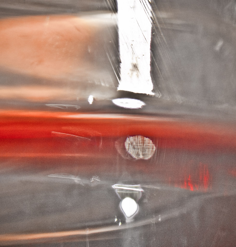 La linea centrale sfuggente e protagonista che delimita lo spazio del frame, è una cortina-orizzonte apparentemente invalicabile, eppure conduce ad una separazione, ad una frammentazione, ad una dispersione della linearità e dell'organicità. Un attimo prima, era tutto composto e visibilmente identificabile e strutturato, ma la sensazione del risucchio, del vortice data anche dalla direzione dell'uscita dal frame, in basso, fa si che avvenga una scomposizione molecolare (perchè possiamo immaginare un oggetto che si decompone, ma anche un corpo che si ricostituirà alla fine del percorso) sul bordo di questo immaginario buco nero, nel quale si forma, in entrata, il mix indistinto e fluido, che esplode in fondo dall'altro lato, al suo confine inferiore, in un buco bianco, dando origine ad un nuovo universo parallelo, adiacente atomicamente al nostro, e che prende il nome di "mondobrana".