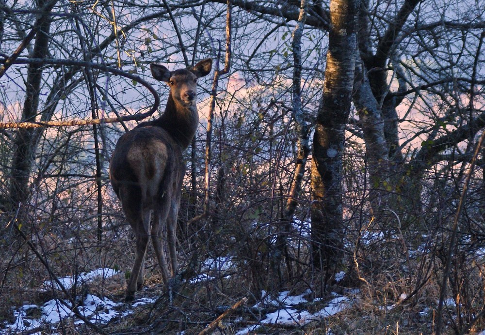 Faccia a faccia con una Cerva adulta inseguita tra la folta vegetazione .