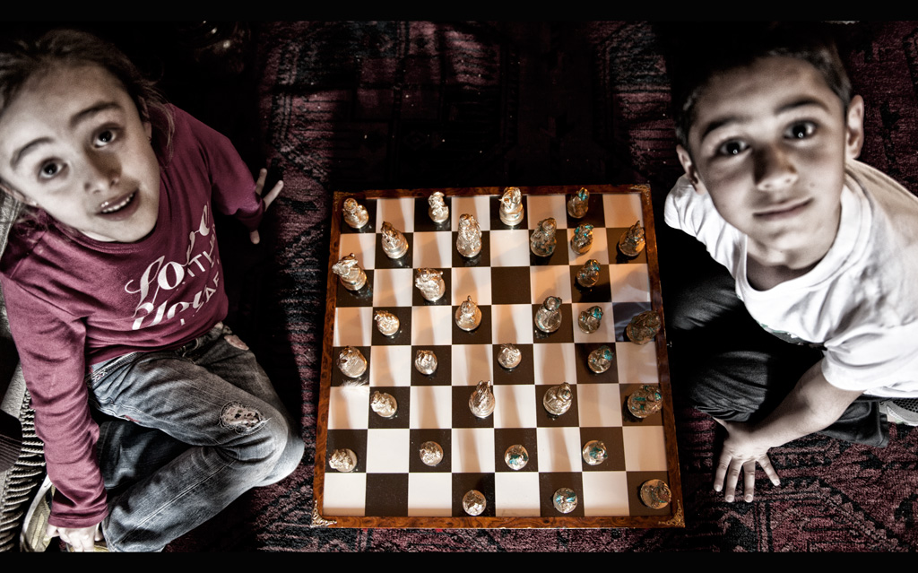 Non essendo uno scatto studiato, non ho fatto altro che immortalare i due bambini, che tra le altre cose non sanno e non hanno neanche intenzione di giocare veramente a scacchi.