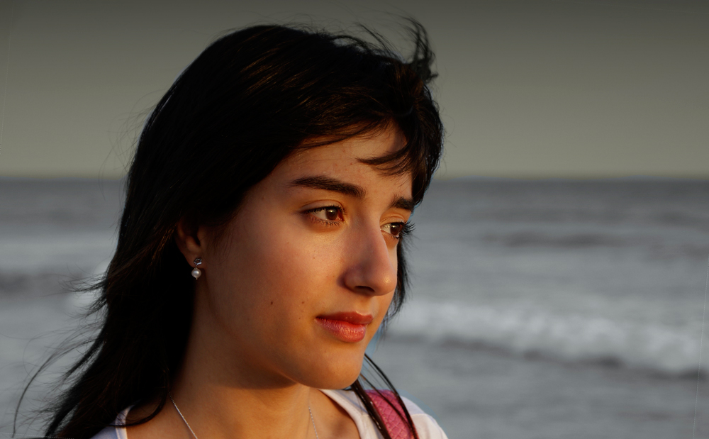 Condivido i complimenti per la modella che hai colto con un'espressione dolce e malinconica, così che la foto risulta molto naturale. La luce è bella (ma non mi sembra un gran che il cielo per il tono grigio tendente al giallastro). Trovo infine che il nero dei capelli sia veramente troppo chiuso.