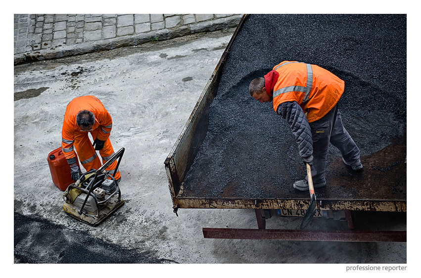 Mi piace molto questa serie “street in progress”, con il deciso contrasto tra le varie tonalità di grigio dell’asfalto e l’arancio vivace delle tute degli operai.