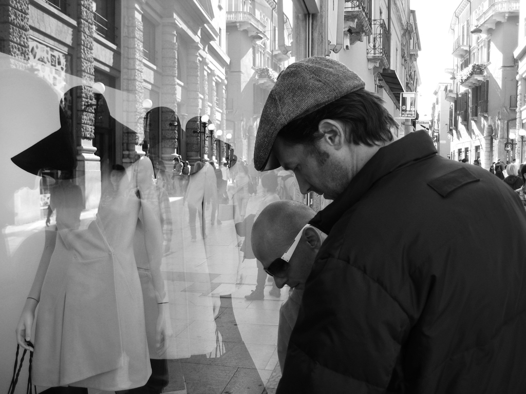 Curiosa la coppia di maschi che si ferma a guardare una vetrina di abiti femminili; piacevoli i riflessi che creano un gioco di ripetizioni con i manichini e gli elementi architettonici del palazzo che si specchia nel vetro. Solo l'angolo in alto a destra non mi convince affatto, con il bianco del cielo tutto sparato.