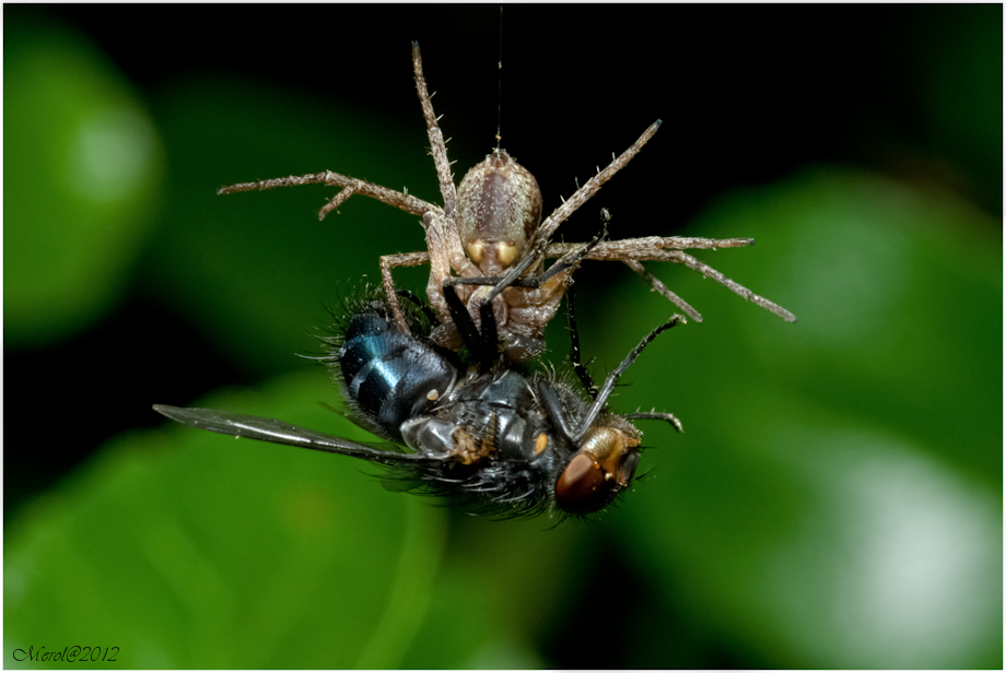 Non ho avuto molto tempo perchè stava iniziando a piovere(si vede una gocciolina sull'occhio della mosca,che sembra una lacrima),la mia attenzione è stata attirata dal fatto che i due,ruotavano come una trottola appesi alla tela,la mosca era viva e agitando le ali generava quel turbinio,in una delle pause sono riuscito a scattare,poco dopo, il ragno, ha portato la preda verso la tana in cima, la pioggia è aumentata e ho dovuto desistere Triste