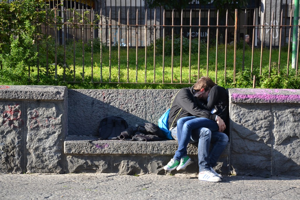 Decisamente una bella foto, da un lato l'atteggiamento di intimità dei due protagonisti e dall'altro quello vagamente freddo, anonimo, periferico del luogo, contrastano perfettamente fra di loro.