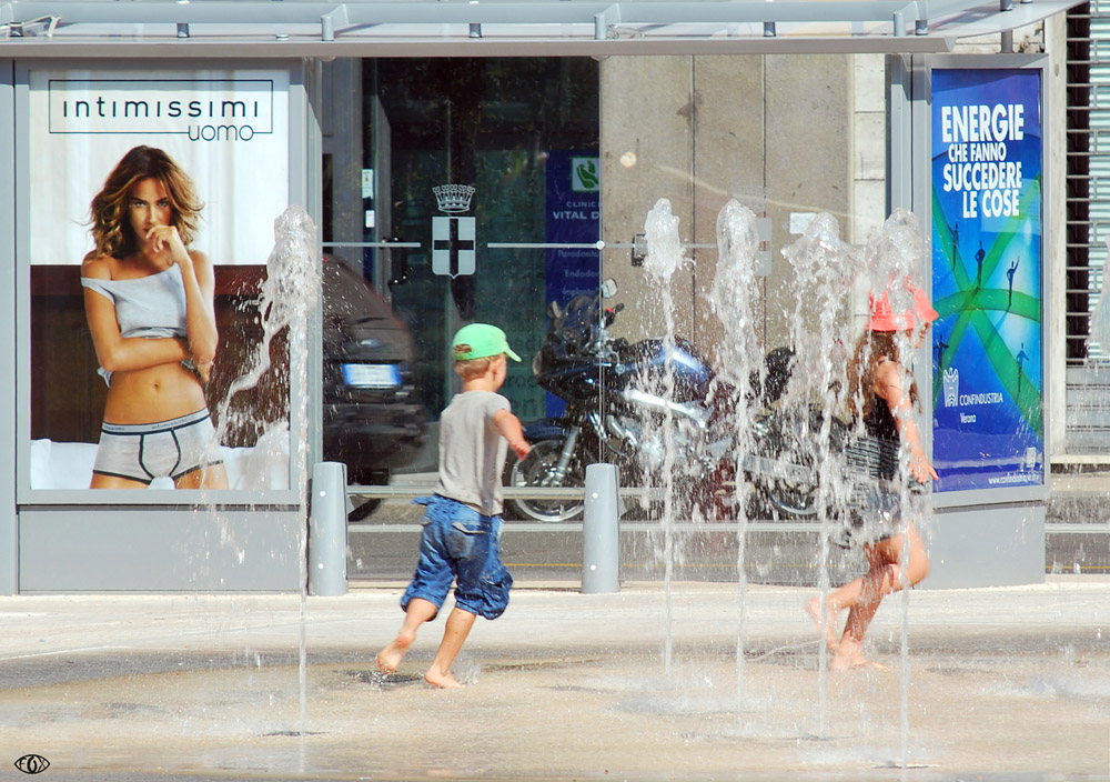 Avrei decisamente escluso il cartello pubblicitario a sx, che attira troppo l'attenzione, non entrando per contro a far parte del contenuto narrativo della foto, che abbina il movimento giocoso dei bimbi alla scritta "energie".