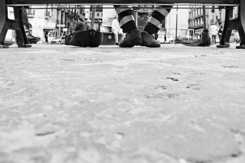 Detto questo, non posso fare a meno di commentare anche l'aspetto "formale" che, nella mia personale visione della fotografia street, é comunque imprescindibile. In questo caso, l'aver dedicato praticamente 3/4 del fotogramma al primo piano della pavimentazione stradale, che non offre alcun elemento di interesse (neanche a livello di semplice "texture", grafismi o variazioni tonali di grigio), crea un forte disequilibrio nella composizione. Lo sguardo dell'osservatore "scivola" inevitabilmente sull'estesa area sfocata in primo piano e arriva alla parte alta, che risulta invece ricca di elementi, ma nessuno dei quali capace di spiccare e catturare interesse. Lo sbilanciamento tra le due parti é rafforzato dalla distribuzione dei toni di grigio.