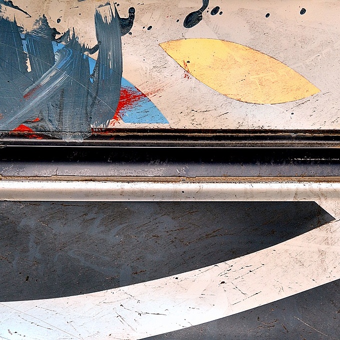 mi piace molto questo astratto urbano: quando si divide un due parti, la parte superiore colorata, materica le pastosità di colore sulla sinistra, la varietà delle forme; la parte inferiore più rigorosa, bicolore che mantiene comunque i segni della materia da cui é definita, le righe, che diventano crepe dove l'asfalto si é alzato per l'umidità e il calore, definiscono un elemento vivo, come se fosse vecchia pittura grumosa su tela, riportando all'intervento umano, non solamente urbano, ma reso artistico dalla composizione del fotografo.